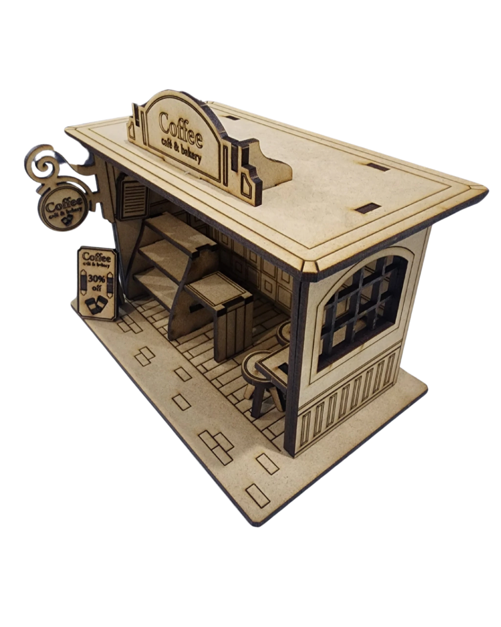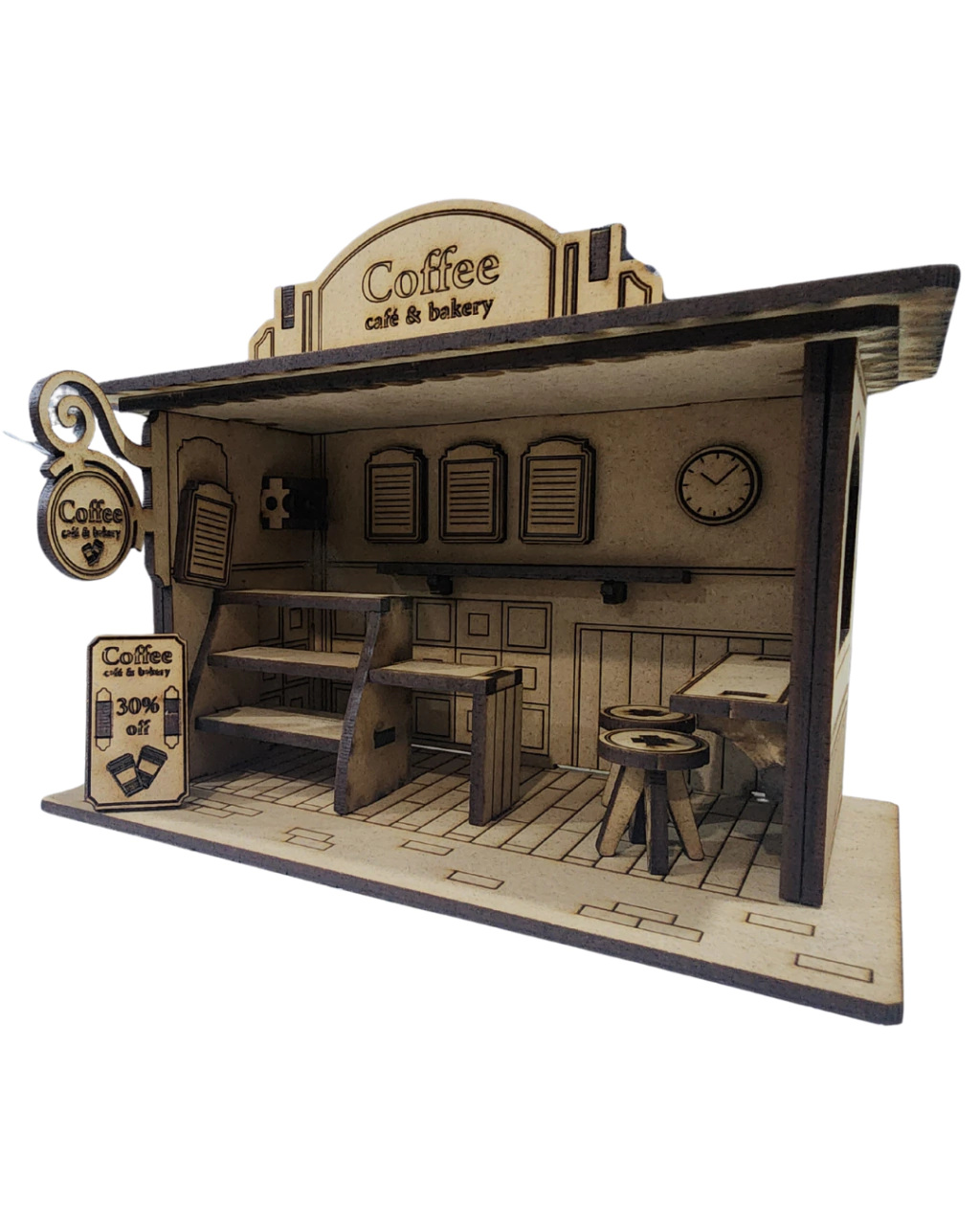 Motivo TIENDA de Cafe - Tamaño pequeño - mostrando cada detalle, desde los muebles de la tienda hasta los objetos diminutos como los carteles, banquitos, mesas y decoración típica de una cafetería.
