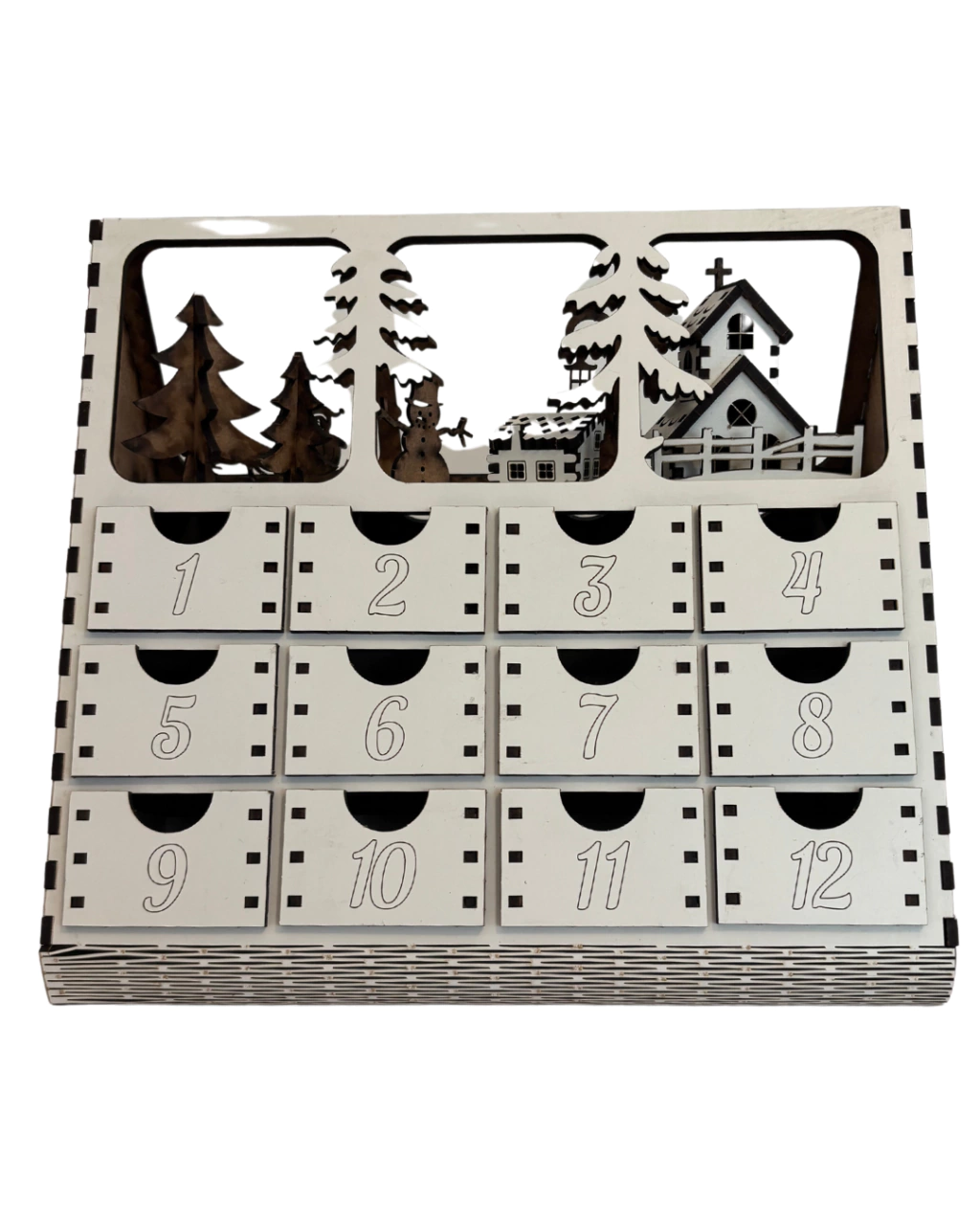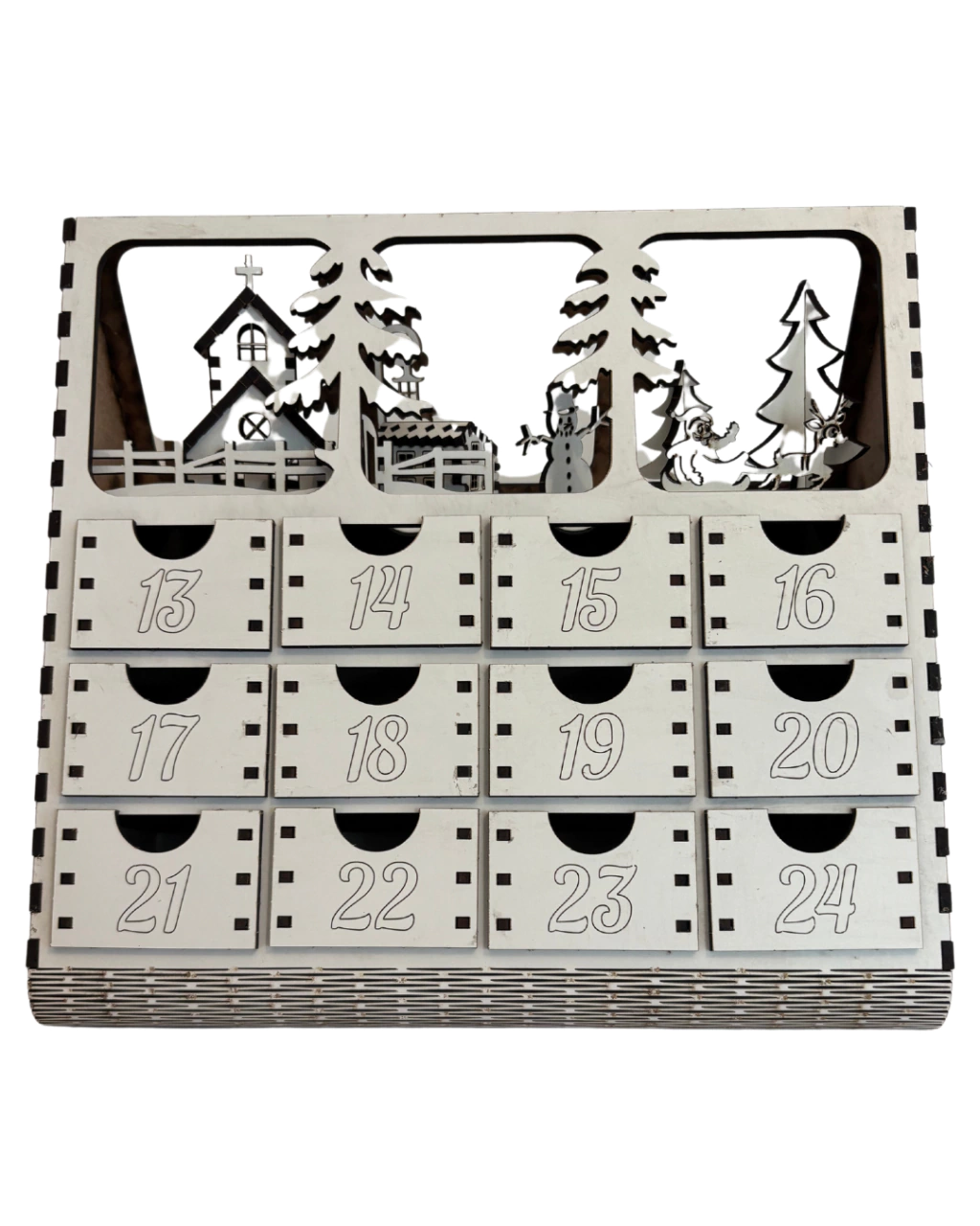 Realizado en MDF crudo de 3 mm de espesor con 24 cajones movibles y diseño navideño
